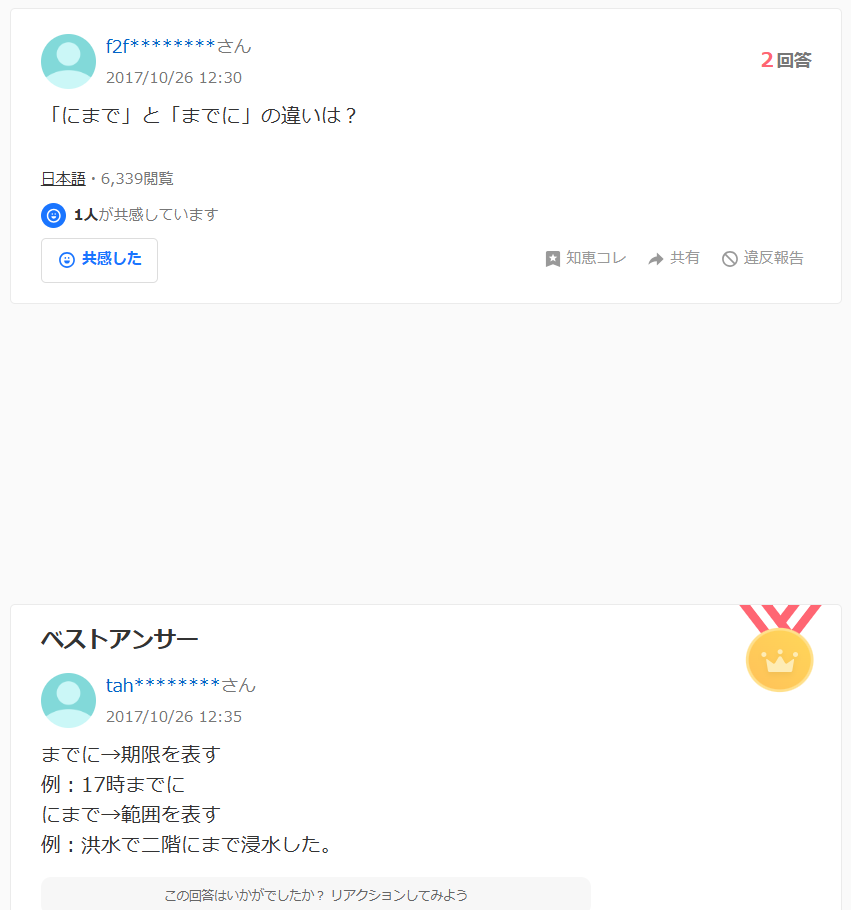 >>737518 >Не までに, а にまで。 А я не пони разницы. Скринчик >>737486 меня только запутал. Типа までに означает только границу, а にまで - всю окруженную ей территорию или что? Тогда причем там первый пример, который явно не значит один момент во времени, а как раз-таки некий длительный промежуток до пяти часов?