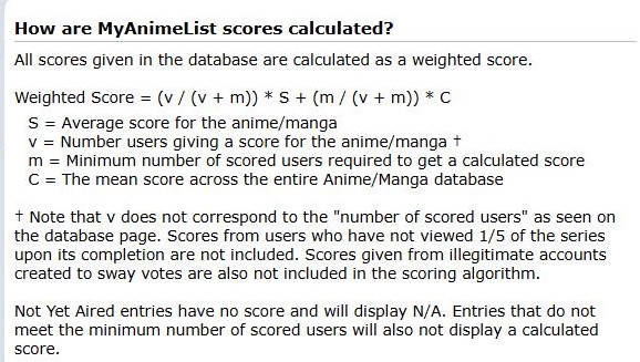 >>738324 >Большая популярность означает, что тайтл решит попробовать большее количество тех людей, которые не фанаты того, о чём тайтл, и они поставят более низкую оценку Эмпирически это не подтверждается, просто взгляни на топ мала чисто по ранкеду: https://myanimelist.net/topanime.php?type=favorite Что мы там видим? Да те же самые тайтлы с миллионами просмотров, что и в обычном топе по популярности, просто немного в другом порядке. Кстати там есть и третий топ, он же основной, который совмещает оба показателя через взвешенный по пикрил формуле рейтинг. В нем у слайма самое высокое место это #254, причем что странно, у второго сезона (у первого сезона вообще #482); у ведьмы #365, что ниже, но нету заведомо нереального разброса #81 vs #372. >А ещё популярное аниме может быть иметь заниженную оценку из-за хейтеров. О, это про меня, занижаю оценки всем исекаям >не забудь через 30 лет проверить на мале стату ведьмочки и слизня. Это не самое важное. Самое главное - не забыть через 30 лет запостить анализ с обновленными данными на двачик.