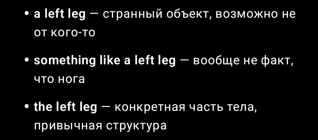 >>738904 Вот например я посмотрел с десяток сериалов на английском и знаю пачку разных фраз и ответов на них. Я их просто заучил, ну потом еще проверил их написание, когда еще они произносятся, и как их можно немного модифицировать. Я не переводил их на русский буквально, по словам. Если мне нужно будет еще что-нибудь сказать чего я не знаю, то я просто посмотрю какой вариант мне предложит гугл переводчик. Запомню эту фазу и потом сравню в голове с другими фразами - чем они похожи (по контрукции) и чем отличаются. И врот ебись этот русский, он просто идет параллельно и никак не участвует в процессе изучения английского.