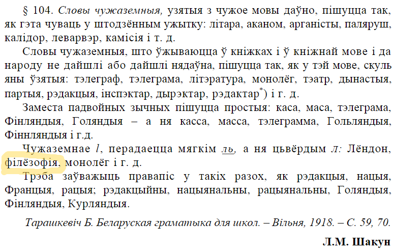 • Во-вторых, мешанину ѳ/т в русском языке («терапія» но «миѳъ») и л/ль («философия», но «ляпис» и «плюс», «Лапландия», но «Финляндия») невозможно было перенять в белорусский язык, обосновав логически. Россияне про свой язык могут сказать: «Да бля, так исторически сложилось, нам нормально». (И будут совершенно правы.) А что было Тарашкевичу делать? Перенимать этот хаос и сказать: «Да вот, я решил всё передрать из русского языка». А у поляков всё просто как палка: греческое th практически всегда t, европейское l практически всегда l (ль). Всё просто и логично. Так что должен был делать Тарашкевич: перенимать хаос из русского языка или простую польскую систему адаптации заимствований? Если не болеть полонофобией, то нужно признать, что он всё сделал правильно. Да и не одни поляки th превращают в t. Тарашкевич мог видеть, что так делают и немцы (по крайней мере в произношени).