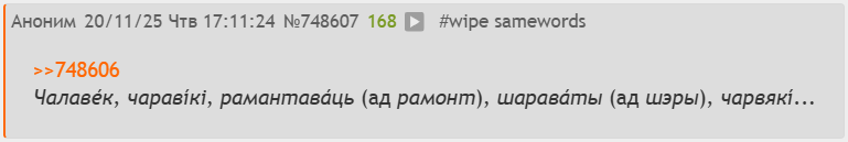 >>749119 >Есть и другие: например, полезно будет отправить на свалку прижившуюся формулу “как слышится, так и пишется” (она и сейчас-то не правдива). Она навязывает белорусам необходимость произносить так, как написано, а это тоже какой-то бред. Ну не знаю. У всех славян такой принцип во главу угла поставлен, никто особо не страдает. Белорусы тоже вооружились этим методом. >А от белоруса требуются эти бредовые калькуляции: он как бы “обязан” произносить “вясна” с аканьем, но при этом “обязан” произносить “тэатр” без аканья. (?!) Бред, бред и бред. Просто нахуй. Строго-настрого нахуй. Слова должны подстраиваться под фонетическую систему и орфографию, а не язык под слово. Тут я согласен. Не должно быть того, что одни слова пишутся и произносятся по одному принципы, а другие — по другому. >Происхождение слова “калгас” покрыто мраком. Возможно, в оригинале это было сокращение “кал. гас.”, которое потом слилось в одно слово. Неважно Это почти 99,9% так. Словно новодельное, так как в других языках похожих форм не нашёл. >Важно то, что оно закрепилось в обороте миллионами употреблений, и выковыривать его, навязывая форму “калгос Ну тут ты прав, огульный прескриптивизм — зло. Но мы тут скорее обсуждаем, я так-то за то, чтобы оставить нынешнюю норму с постепенным фиксом самых странных моментов вроде сохранения "а" в написании по какому-то вроде как морфологическому принципу в неходовых словах. Пусть орфография развивается постепенно. >>749122 >тем более полякам свои гейтарашкевичи могли поднасрать или тупо как русяз пишут болото а говорят балота Ты в Узбекистане осилил русский язык, сейчас луркаешь про белоруский, но не в состоянии хотя бы посмотреть фонетику и орфографию других языков? >>749120 >никакого О в слове гаспадар нету Нету, так как ударение на первый слог не падает. Но оно должно, по логике вещей проясняться. Но это зависит от чутья уже самого человека.