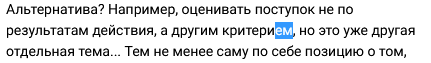 Всё равно "оценивать [не по [результатам действия], а [другим критериям]]" более ожидаемо, чем "оценивать [не [по результатам действия], а [другим критерием]]".