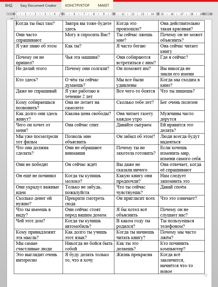 Ананасы, нашел у себя старую таблицу, которую я применял для отработки времен и скорости аутпута, где нужно нарезать лист на карточки и по одной переводить вслух. Тема рабочая?