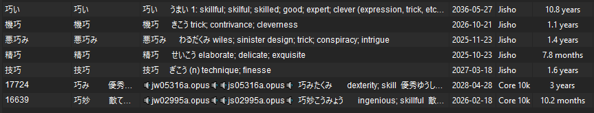 >не все карты новыми словами являются Кор10к готовая колода, остальное я добавлял в свою по мере встерчи в контенте, и иногда загружал списки слов. Там слова, иногда устойчивые выражения (только если есть в словаре), изредка поговорки (так же), и некоторые географические локации типа префектур, городов, районов Токио и т.п.