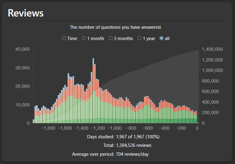 > Ты больше 2к дней учил Начал анки где-то через месяц после начала изучения японского, за который попримерялся к разным методам изучения и прошёл 2-3 главы генок. Первые 20к слов были за первые 2 года, потом стал реже встречать новые слова. Щас стоит 10 новых в день, но я часто меняю в зависимости от размера бэклога.