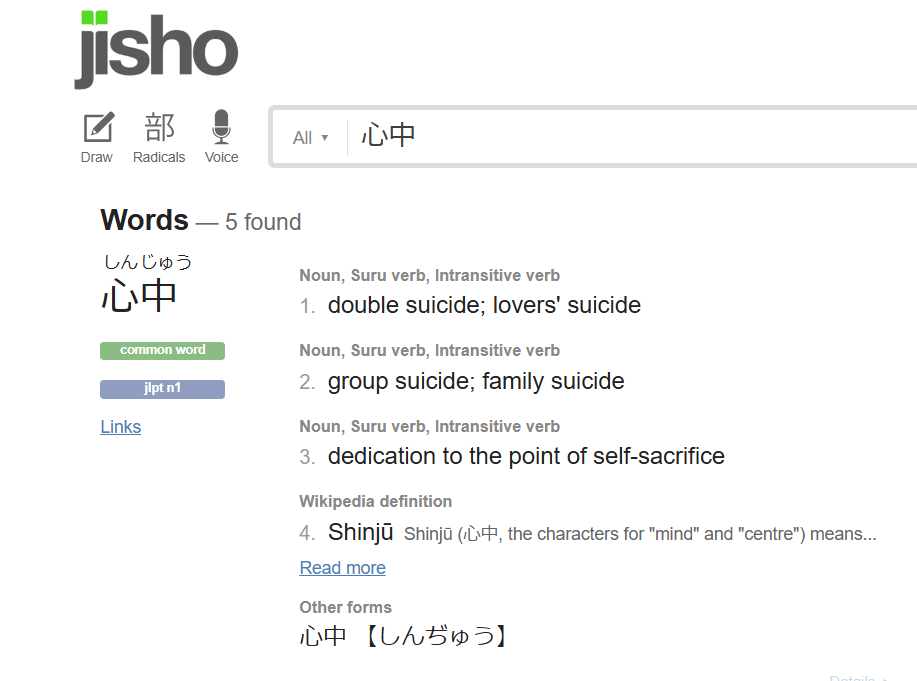 >>745196 > имел в виду перевод, или имел в виду охарактеризование ситуации Я не очень понимаю как на это можно ответить. Если ты говоришь, что dedication to work это именно про третий вариант, то где у 心中する находится мурча этот dedication. Можно сказать to do dedication сохранив значение? Если нет, то это перевод или характеристика?