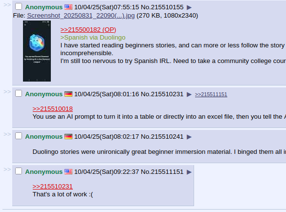 >А какие доказательства, что хоть кто-то выучил язык по Анки, тем более "быстро"? Анки позволяет быстро выучить кучу слов. Это факт. Знание языка это знание слов. Хоть перепогружайся с головой в КАЛТЕНТ если ты не имеешь словарного запаса то язык ты знаешь плохо. А как мы знаем калтентоизучение самый медленный способ изучения слов.