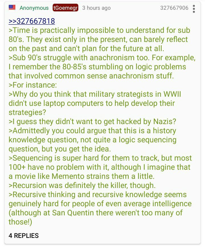 >>745092 >давай не будем. Калтентолюбители вообще НИКАК выражать мысли не умеют Так, погоди, давай будем. Ты учил единственно правильным путём язык, а "поглощатели" у тебя в лучшем случае B2 за 10 лет достигают. Следовательно, у тебя-то уж точно уровень выше B2. Так ты "хоть как-то" (B1) умеешь мысли выражать, или естественно и грамотно(C1-С2)? А то что-то не сходятся показания. Может, напишешь пару предложений на английском в ответ на этот пост? Глядишь, сомневающиеся поймут реально силу Анки.