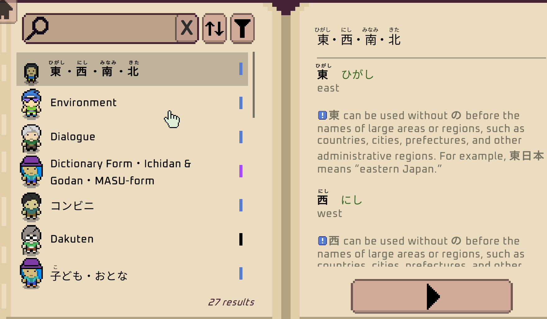 >>749176 >>749160 Когда я начинал учить японский, у меня эти слова легко слёту запоминались без всяких шпор (и анок). Вы в 40 лет учите чи шо? Хотя, возможно, я многие из них просто уже знал заранее, так как у меня к тому моменту уже около 550 аниме тайтлов было отсмотрено. Как минимум север я заранее знал по 北斗の拳 и 北風, оставалось только связать значение с чтением きた, которое уже и так прочно сидит в голове. А 東 есть в названии аниме 東のエデン。Остальные возможно просто по фразам из аниме (「上だ!」) могли уже быть отложены в памяти в той или иной степени.