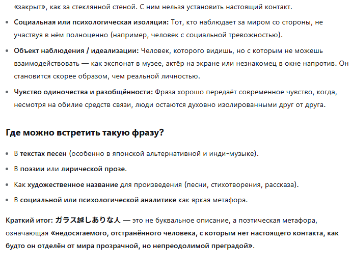 >>749557 Ну тут всё просто, ありな人 - 人, который характеризуется тем, что у него что-то ある. "Человек, у которого есть ...", в данном случае ガラス越し. По ガラス越し можешь глянуть что у меня нагуглилось https://toha3.fromation.co.jp/archives/525 Ну там как бы на кадре видно, что на неё через стекло пялятся. Думаю, помимо прямого смысла, подразумевается и переносный, типа какое-то юмористическое обыгрывание популярности, типа фанаты/поклонники/воздыхатели есть. Как-то так, в общем.