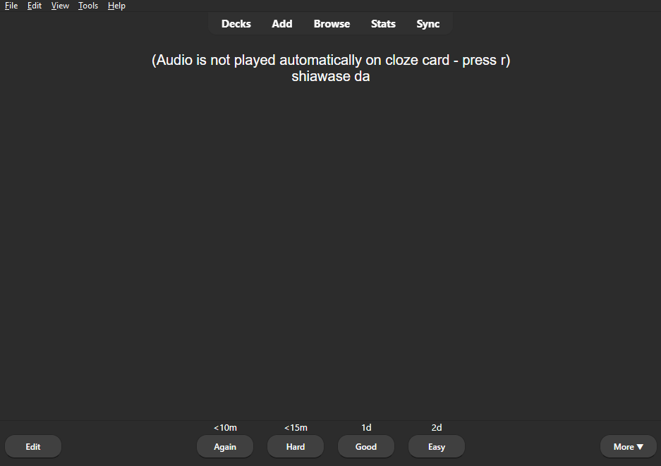 >>750410 Мне кажется очень повезло с колодой. Там заранее было 12 тысяч карточек, 6к с текстом и 6к точно таких же, но со звуком, а когда нажимаешь ответ, там был и текст и звук мимо