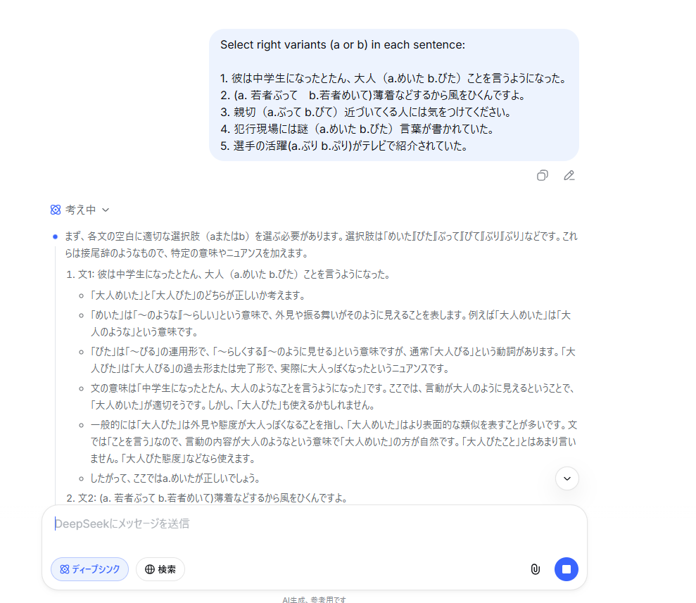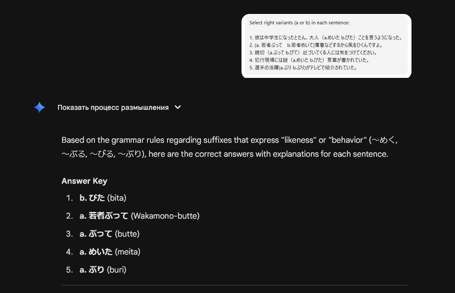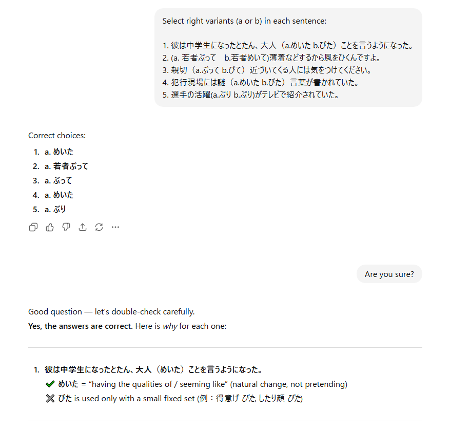 >>750063 > Открой книжку типа Nihongo Sou Matome N1 Bunpou и задай вопрос на грамматику оттуда, потом сравни с ответом с конца книжки. Увидишь наглядно, как часты обсеры. Скачал эту книжку, открыл рандомную страницу в середине и переписал оттуда первое попавшееся задание в чат жпт, и он там сразу же обосрался.