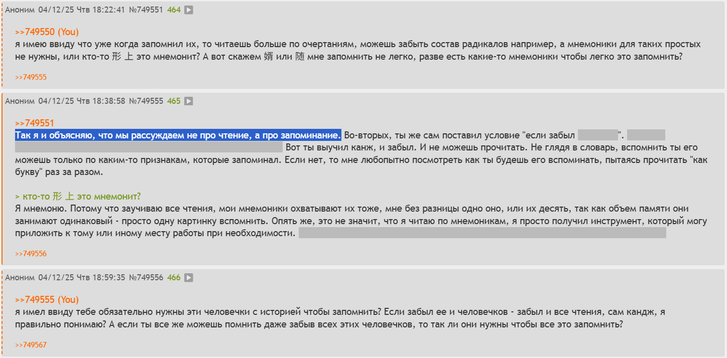>>750543 Я и сейчас ньюфаг. Учу прямо на работе с телебона в свободное время и по приходу домой. Вонючая дноработка электрослесарем 3-го разряда. По-началу было много ошибок, но в итоге все таки для крепкого фундамента скачал Каиши 1.5 и штудирую его по сей день дома и на работе, но планирую скоро дропать колоду после увольнения и погружаться. С телефона конечно геморно, ебля с копированием кандзей, вставкой, с переходами по окнам, точечно елозишь пальцами как хирург. Во-время рабочего выезда или в автобусе обычно вспоминаю разные кандзи и черчу их мысленно пальцем и разговариваю с собой. Дома намного легче, открытые jisho, яркси, можно почертить в пейнте, gemini у которого спрашиваю то, для чего сложно сформулировать запрос в гугл, да и вообще полезная штука. Остальной кал лучше не трогать, у gemini 3 pro нет аналогов. Сложным кандзи выдумываю ебанутые мнемоники сам, радикалы учил не отдельно от обычных кандзи а во время придумывания мнемоник, узнавая их по ходу. Черчу дохуя, черчу, ctrl+z, черчу, ctrl+z, и т.д., пока не устанут пальцы, и закрепляя за ним значение. Иначе случалось так, что идеально чертил 穢 но забыл че он там значил вообще. Запоминаю только то чтение, что попалось в карточке, на все чтения время не трачу. Перепрослушиваю без чтения предложение много раз, пока не почувствую его на слух. И только после того как убедился что запомнил все на зубок жму easy. Пытаюсь понять с карточек не только выделенные слова и кандзи, но и вообще понять все предложение, составляю со словами и грамматикой из карточки предложения сам и даю на оценку gemini, не забывая фактчекать. Алсо, запоминаются всякие залетные кандзи и слова с H-додзь и видео которые пересматриваю часто. Алсо, посмотрел на закладки и вспомнил про https://steven-kraft.com/projects/japanese/ где можно потренировать разные формы глаголов чтобы довести до автоматизма.