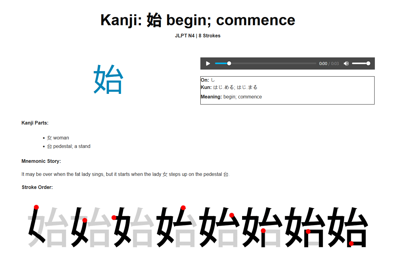 Далее чекаю https://kanji.jitenon.jp/kanji/301 - тут да, как будто есть что нужно, но это для более продвинутых ребят, которые уже знают всю базу итд. То есть я не понимаю 95% того что там есть пока. Круто что там разложено на "женщина + что-то" и "женщита + что-то + рот" - но вот кликая на самом сайте ты не можешь понять что это "женщина + подставка" итд.
