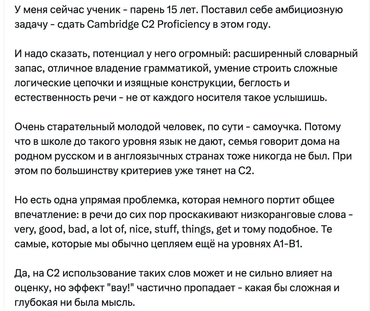 Сходил на урок английского к канадскому преподавателю. Она сказала, что у меня С1 и она не знает чему меня учить. Странное чувство. Я был уверен у меня B1/B2