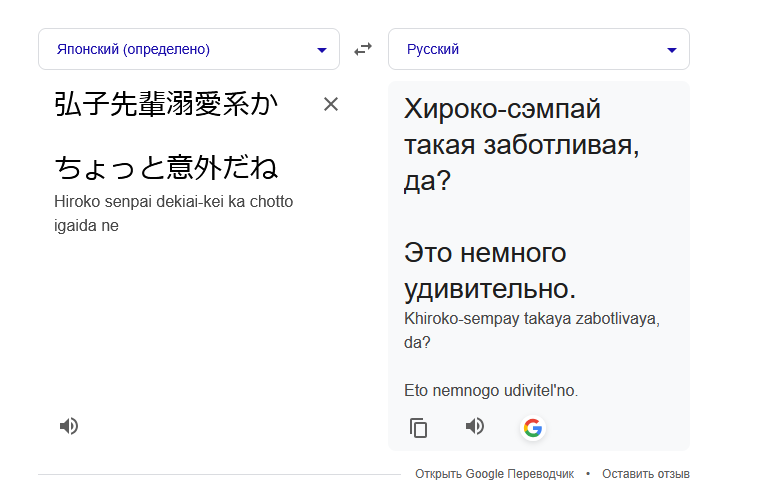 >заботливая >любит на уровне души нечаяния Не охота доебываться, второе очень близко, но вообще 溺愛系 так просто не переведешь, это название специфического жанра. Если максимально упростить, первая фраза там подразумевает что-то вроде "Хироко-сэмпай, ты сейчас ведешь себя как некоторые штампованные героини аниме/ранобок/визуальных новелок, слепо, всей душой и полностью бескорыстно влюбленные в ояша". Подробности тут, кому интересно: https://dic.pixiv.net/a/溺愛