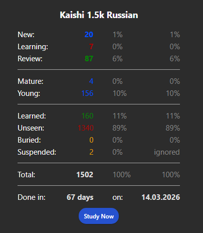 В общем по щиталочкам всяким и спискам учить одинаковую хуйню я ебал, по этому докидываю по 1 слову в день из этой колоды и вроде идет худо бедно, как счет и дни задрочу - думаю что колода дальше изи пойдет по 20-30 слов в день, так как в ней будет тоже самое что уже в кайши уже пройдено.