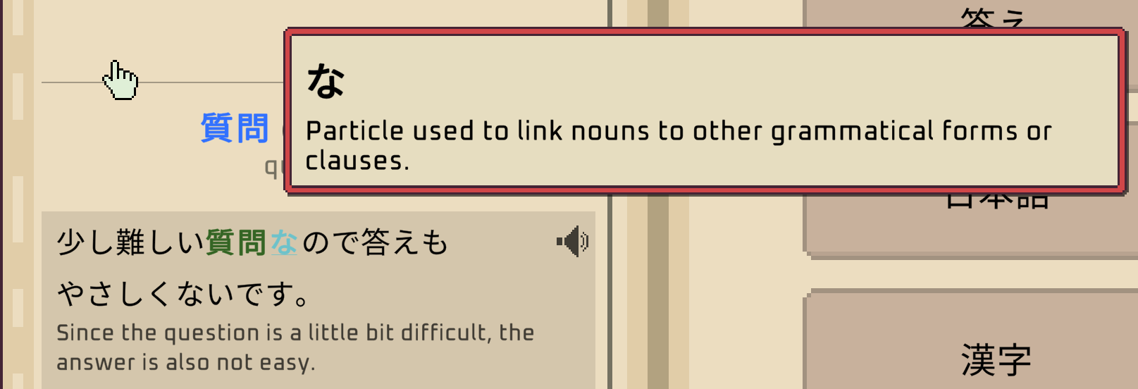 >>753003 >Качаешь Wagotabi в Стиме и проходишь потихоничку. Там как минимум N5 выучить можно, включая базовую грамматику, кандзи и.т.д Пиздёж, там уже в начале игры заваливают тебя хуйнёй которую ты не знаешь, а чтобы открыть справку - надо наугад ебашить. Вся игра по такому идиотскому принципу построена - тебя закидывают предложениями структуру которой ты угадываешь, и только потом в твоём личном журнале откроется справка и новые слова. Эта игра не для новичков.