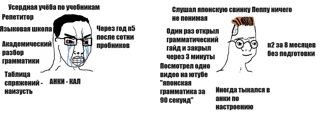 Я регулярно захожу в японо-тред в /fl/ на Дваче и каждый раз спрашиваю, нужно ли качать Анки. Каждый раз мне отвечают, что нет. Я спрашивал уже раз 150, и 150 раз мне ответили «нет». Смысл в том, что отвечает мне один и тот же анки-хейтер, отвечает с неизменной интонацией. А я каждый раз с неизменной интонацией спрашиваю: — Анки есть смысл ставить? — В Анки смысла нет. — А карточки для слов эффективны? — Карточками не пользуемся. — Можно как-то колоды Core 6k скачать, много там слов? — Нет, никаких колод вообще нет. — Я бы хотел поучить кандзи через СРС, посоветуете настройки интервалов? — Извините, у нас тут СРС не котируют. — Проги для запоминания слов есть? Мне Анки нужна. — Она только для тех, кто хочет забыть живой язык. И ведь этот хейтер, зараза, знает мою манеру шитпостить идеально, знает, что я спрошу, и знает, что он мне ответит. Но ещё ни разу ни один из нас ни пиком, ни словом не показал, что каждый из нас знает сценарий. Бывает, хейтер засирает очередного "анкипыникса" в середине треда, когда я отправляю свой пост, тогда я подсматриваю за ним сквозь разметку, он равнодушно дописывает пасту о вреде списков слов, жмет «Отправить» и возвращается к моей цитате: — Что ты хотел, анон? — Мне нужна Анки. — У нас нет. — Жаль. Иногда он поясняет за RTK другому ньюфагу, тогда, мониторя вкладку, я терпеливо жду, когда они закончат: — А Анки для подготовки к N1 подходит? — Нет, мы её не юзаем. Иногда тред просто медленно тонет, в нем никого нет, и только я обновляю страницу. Конечно, он знает, что будет дальше, но не подаёт виду и равнодушно постит вебку с лолей. — Что-то я гайд по настройке карточек найти не могу, он вообще в ОП-посте бывает? — Нет, давно уже не было, мы это не форсим. Это очень суровое, по-настоящему анонимное противостояние, исход которого не ясен. Очевидно, что каждая сторона рассчитывает на победу. Впрочем, я уже согласен на ничью.