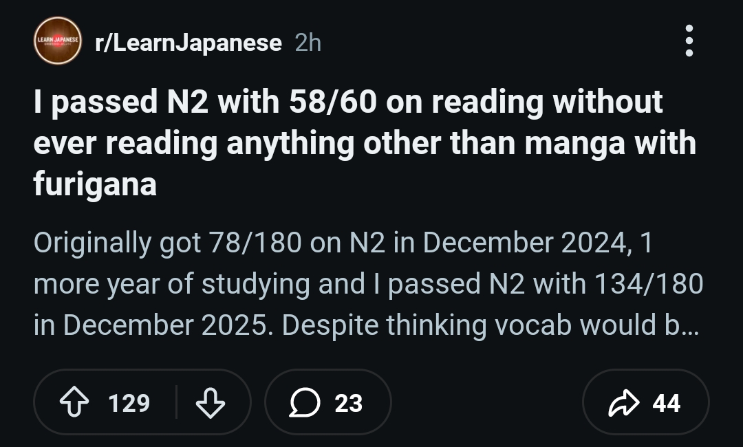 На заметку интересующимся, чекнул штуку под названием JLPT N2 Reading Quiz, скажу так, это детский лепет, ребятки. Слова уровня агуши, даже если ты этот N2 выдрочишь до блеска, свободно не сможешь ничего читать все равно, в любом реальном тексте придется каждое второе слово искать в словаре. Уровень где-то трехлетнего карапуза: агу, агу, мама, папа, кушать, какать.