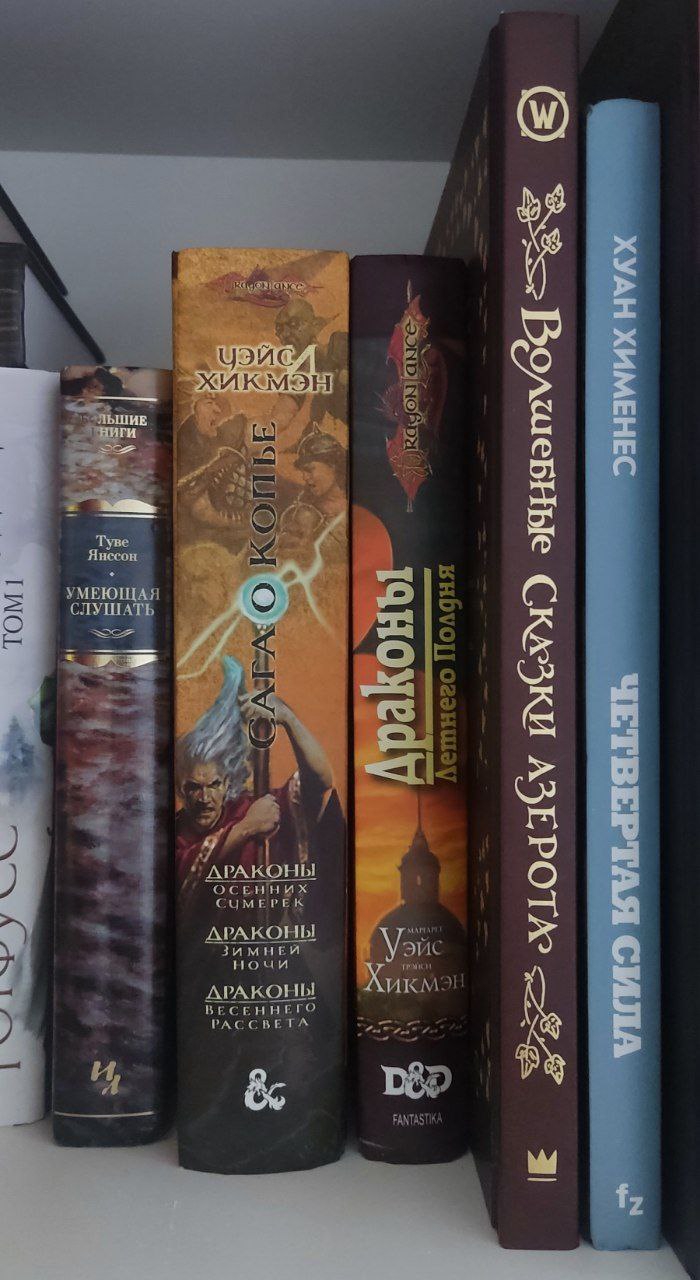 Вот это все прочел кроме испытания, 10\10. Читал про близнецов уже онлайн поскольку в печатном виде так и не нашел в продаже. Остановился где-то на моменте когда Карамон с Тазом прилетели в одну из реальностей и бродили по киселю и не могли ничего сделать, даже и не помню где конкретно чтобы возобновить и прочитать. Зато в печатном виде урвал второе поколение, кузницу души и драконы летнего полдня. Ждут своего часа на полках