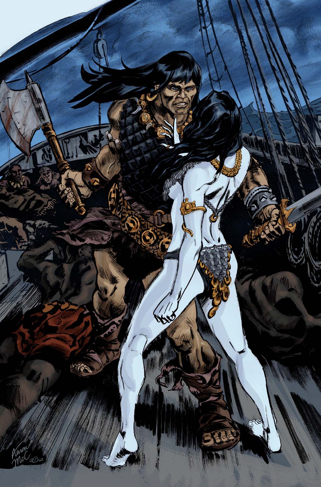И тут внезапно появляется Конан. И даже при том, что чувствовалось - пираты - пугающие, сильные, наглые, но Конан их затмевает и они тушуются.
