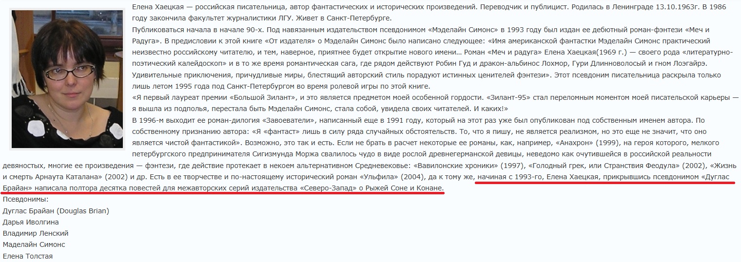 >Интересный способ продвинуть своё имя, а Так наоборот же. Взяла псевдоним, чтобы не замарать свое истинное имя кониной. Ну и, согласись, Конан авторства Хаецкой и других русских авторов как-то странно смотрится. Теряется фентезийный флёр. Ну, в те времена терялся. Я бы не стал покупать. Издатель не дурак. Я считаю нужно было вообще на все книги авторство Говарда лепить.