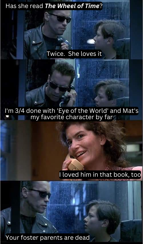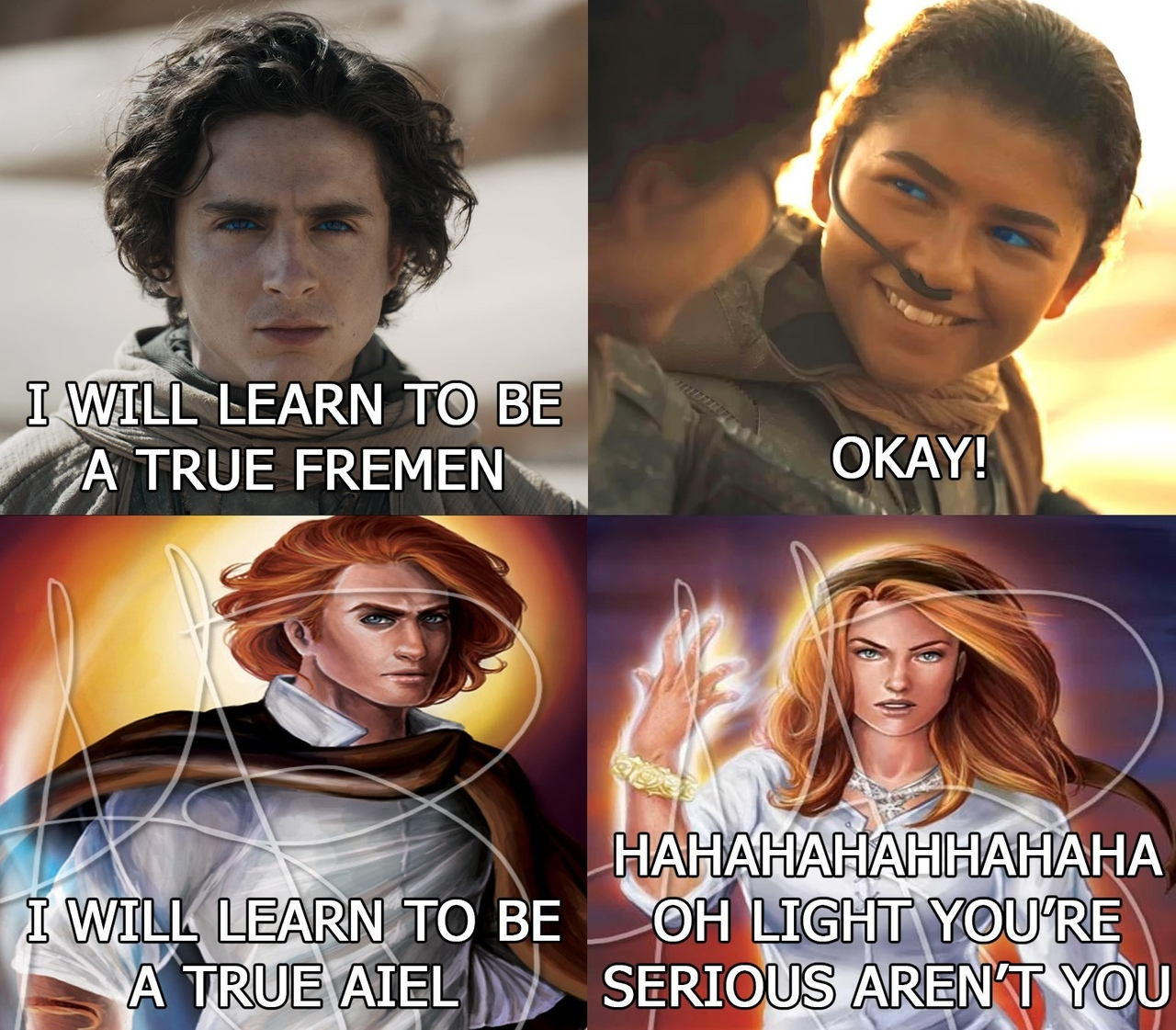>Где они вообще в этих картинах будущего? Непонятно. Насчет отсутствия долгоживущих персов в видениях согласен, сильно условный момент, там будто одна молодежь осталась с чешущимися кулаками. Ну или дети/внуки Муад'Диба Кар'а'карна оказались настолько имбовыми, что прогнули всех и вся на неподконтрольных шончан территориях, включая бабку Кадсуане.