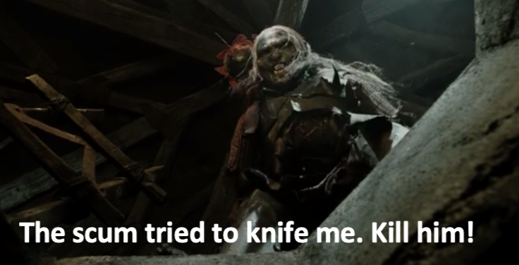 Кстати, если судить по фильму, то непонятно как орки вообще могут поддерживать хоть какую-то дисциплину. У них конфликты со смертоубийствами по малейшему поводу. Армия орков перерезала бы сама себя.