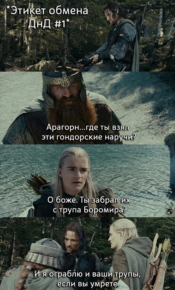 Кстати, наш толчок прям пуля в пулю следует указаниям своего кумира: > Сам фильм “Властелин колец”, что характерно, мне очень нравится. В отличие, скажем, от книги Толкина. Поскольку я, как известно, являюсь мегазнатоком и по совместительству мегаэкспертом с мировым именем в области скандинавской истории и скандинавской же мифологии, то к попыткам творчески переработать культурное наследие Севера и из свирепых конунгов и викингов налепить “рыцарей в белом” отношусь резко отрицательно. Понятно, это вовсе не говорит о том, что “книга плохая”, — это говорит о том, что лично мне данное литературное произведение не нравится. А вот фильм — наоборот, очень даже. Это ж надо так, в сердце хранить завет вождя...