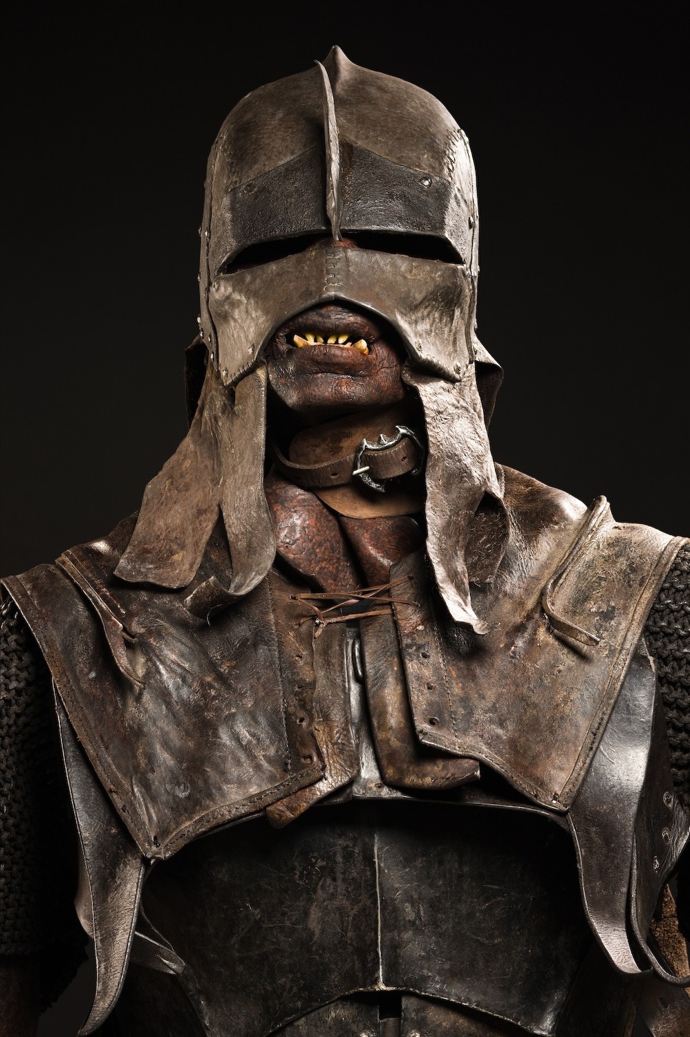 Имеются странности и с корпусной защитой. Наручи и поножи это прекрасно, хотя наручи уж слишком сильно крупные, такие будут мешать в бою, особенно в плотном строю. А вот с кирасой беда. Основной элемент нагрудника слишком рано переходит в подвижные сегменты. Урук-хай не фитоняшки, пресс в бою им прорабатывать незачем, а кирасу при прочих равных стоило бы дотянуть до бедер, чтобы ее вес распределялся на плечи и бедра, так удобнее носить и защита лучше. Металла в армии Сарумана явно полно, так что такая странная экономия выглядит мягко говоря не очень. Зато есть достаточно интересный штришок - кираса, ее наиболее развитый элемент, снабжена неким вариантом горжета - защиты горла.