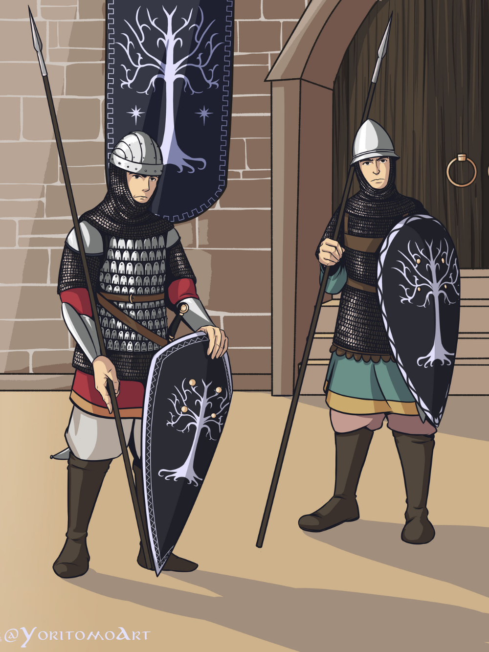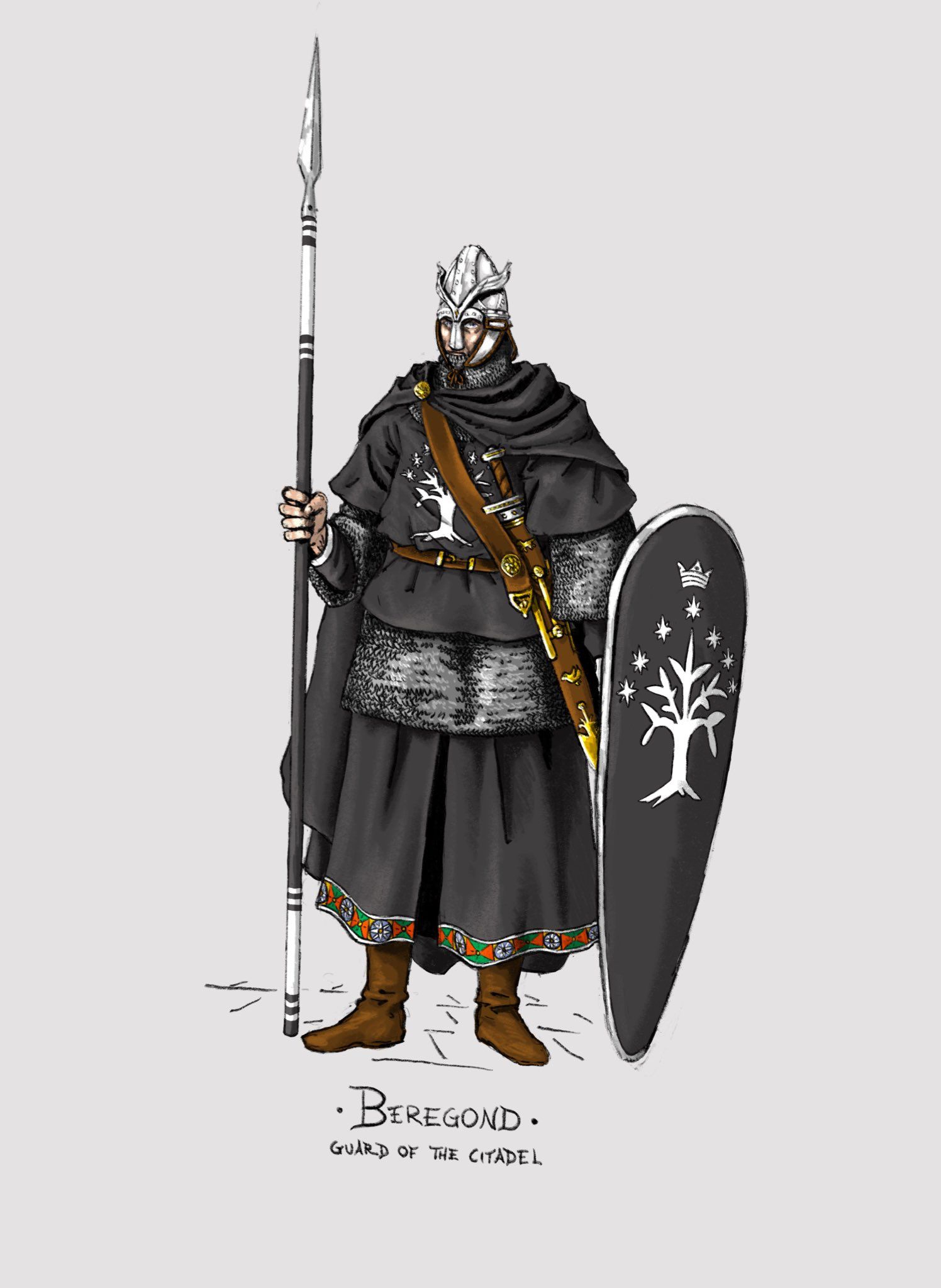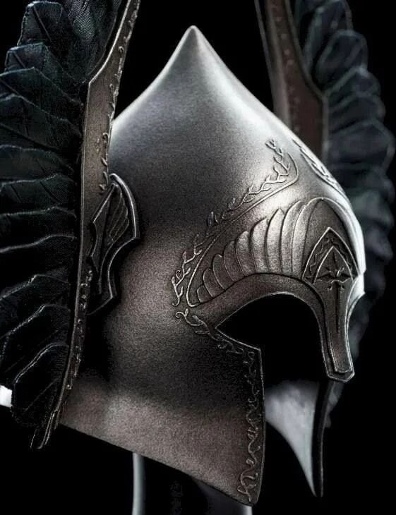 >>560386 Все, нашел анончик >“The Guards of the gate were robed in black, and their helms were of strange shape, high-crowned, with long cheek-guards close-fitting to the face, and above the cheek-guards were set the white wings of sea-birds; but the helms gleamed with a flame of silver, for they were indeed wrought of mithril, heirlooms from the glory of old days. Upon the black surcoats were embroidered in white a tree blossoming like snow beneath a silver crown and many-pointed stars. This was the livery of the heirs of Elendil, and none wore it now in all Gondor, save the Guards of the Citadel before the Court of the Fountain where the White Tree once had grown.”