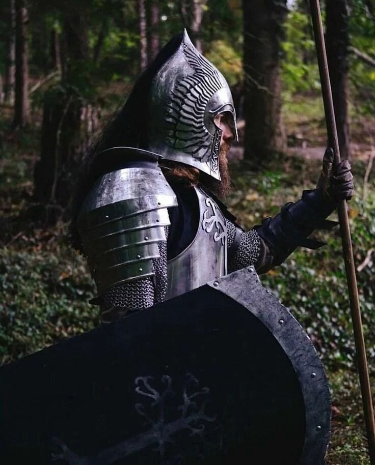 Как всем понятно, защитный комплекс пехотинца длительный исторический период строился вокруг щита. Большую часть истории - щит был расходным материалом ( относительно конечно), изготовлялся из дерева ( автор понимает, что делали их очень по разному - классика это деревянный каркас обтянутый кожей, про всякие способы изготовления щитов из наборных дощечек и т. д. здесь рассказать нет возможности, хотя это безусловно интереснейшая тема) Урук-хай используют металлическое нечто, которое сужается книзу. Такую форму достаточно часто можно увидеть в нашем средневековье, но вот беда, использовалась она кавалеристами. Для всадника каплевидная форма щита ( или что то похожее) это отлично. Едешь ты такой красивый на лошадке со щитом и нога прикрыта до колена или хотя бы до бедра. Чем прочнее был основной доспех тем меньше становился щит.