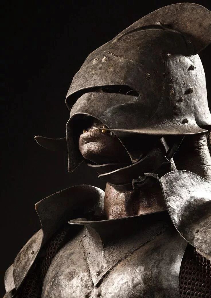Саруман создает армию именно как войско дисциплинированных (насколько это возможно) солдат. Основная ударная сила - пешие пикинеры, прикрытые арбалетчиками и неким вариантом кавалерии на варгах. То есть перед нами некий аналог тех же римских легионов, только значительно лучше защищенных и нацеленных именно на борьбу с "легкой" кавалерией Рохана. В кино нам показывают именно армию нового образца, т. е. формата этаких сильно прокаченных швейцарцев или испанских терций. Только вместо пушек и мушкетов с аркебузами у нас тут аркбаллисты и арбалеты с луками. Насчет доспехов. Все такое неизящное, сделанное массово, без учета индивидуальных особенностей оркского тела, подчеркивающее индустриализацию, проведенную в Изенгарде. Все каски имеют основу из цельного куска металла, на который приклепываются дополнительные элементы. Все шлемы орков дают возможность вдыхать экологически чистый воздух Средиземья полной грудью и в целом для пехоты это плюс, так как вечно куда то топаешь или бежишь, поэтому в закрытом шлеме очень тяжело. Смотровая щель дает возможность неплохо так покоситься влево или вправо, проверяя как там дела в строю. А развитый "гребень" в свою очередь, позволит сержанту (или кто там у них) быстро выровнять бойцов в строю , ну и все же дополнительная защита от удара сверху.