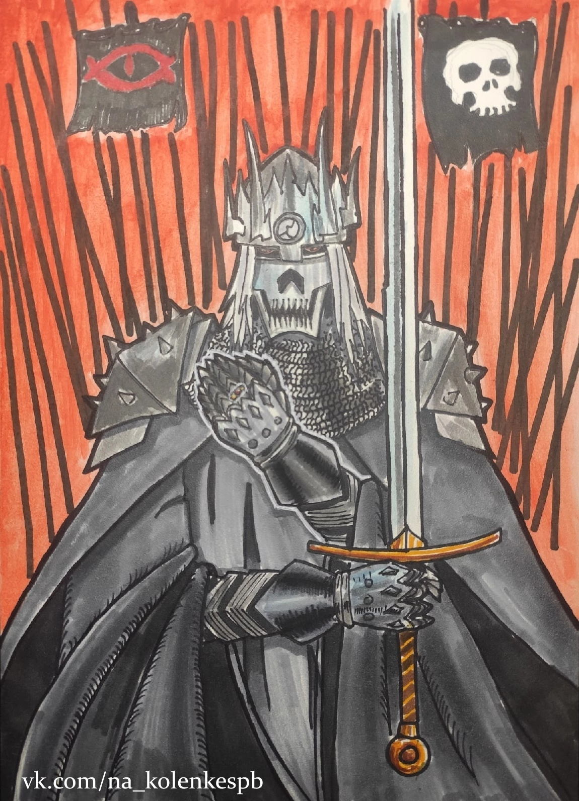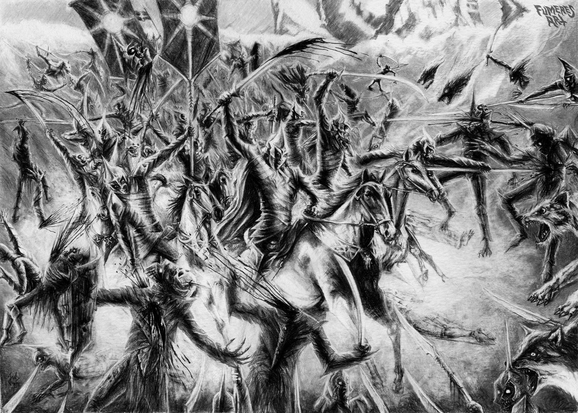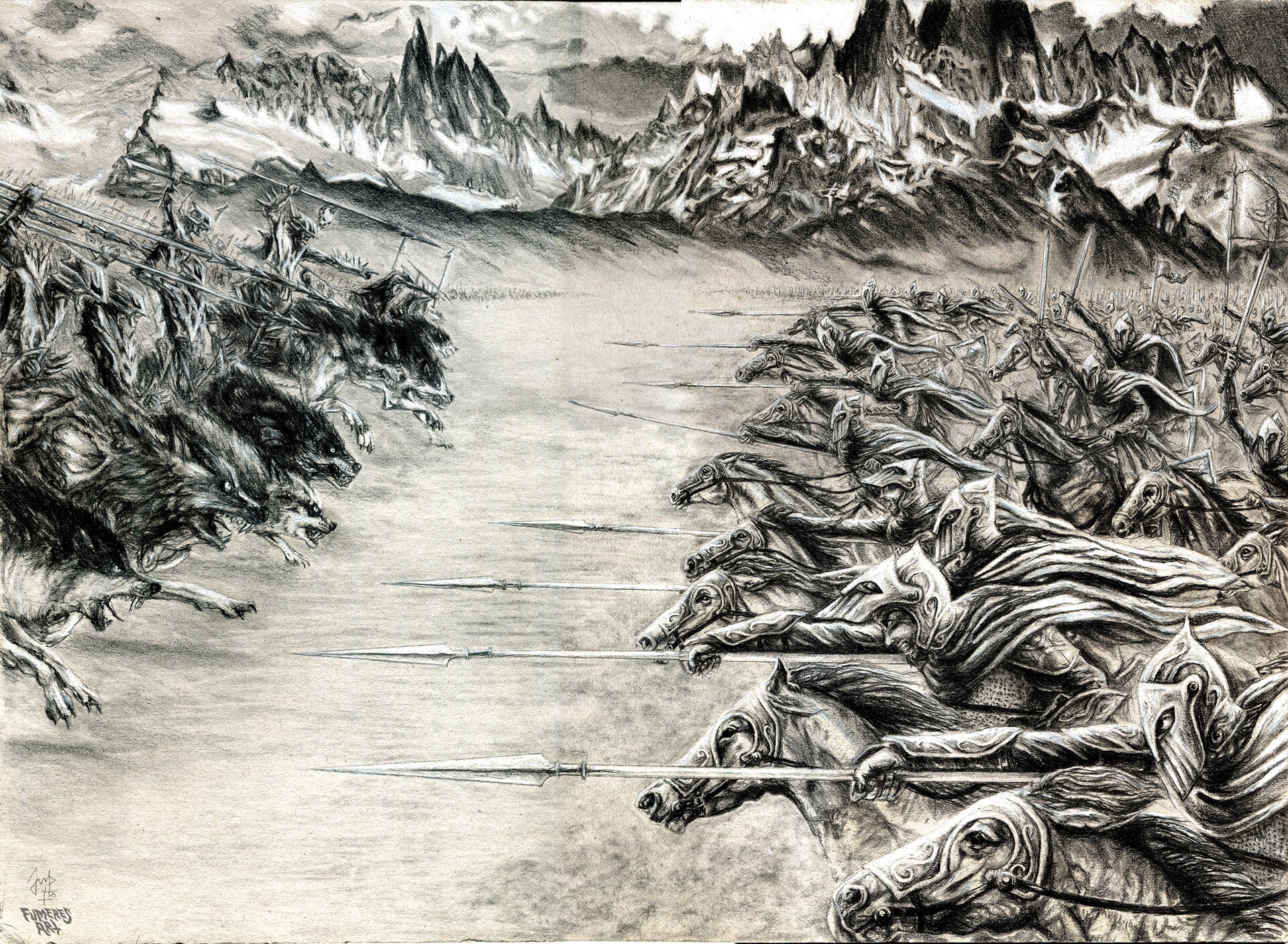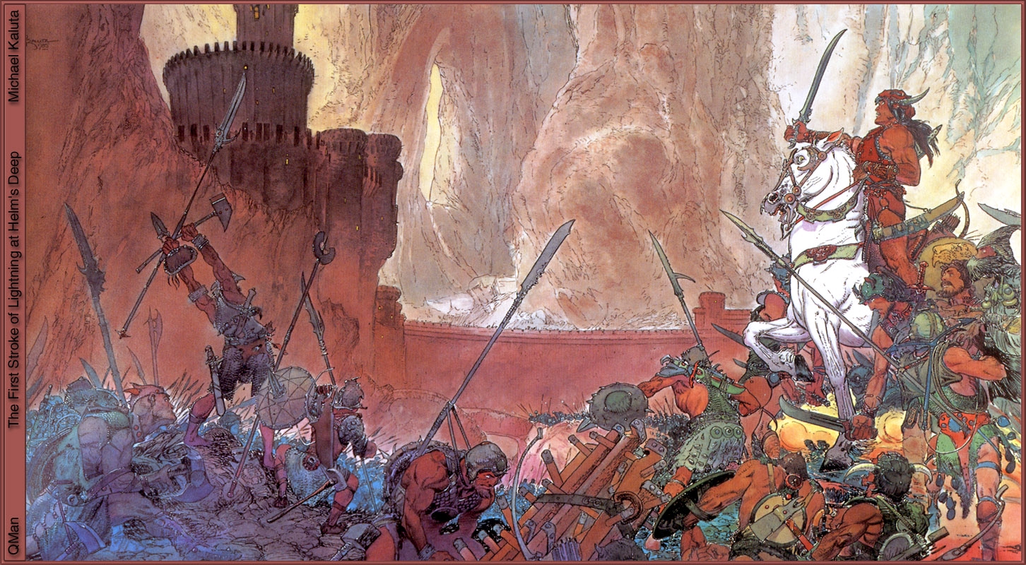 Я рисователь, даже профессиональный. В юности хотел нарисовать как в Гондор приходят воины Форлонга. По моему представлению, они должны были идти по мощеной мостовой, и на них сверху падали бы лепестки роз. Они были с бердышами, доспехи на них были бы сходны с фильмовыми, только шлемы формой как у эллинистических фалангитов, с завитушкой-колпаком сверху. Но далее набросков не продвинулось. Если найду, запощу. А еще я битву при Азанулбизаре(или как там) рисовал.