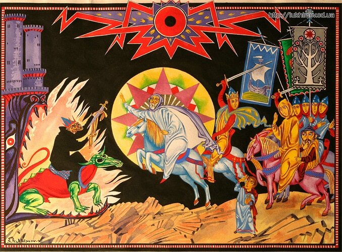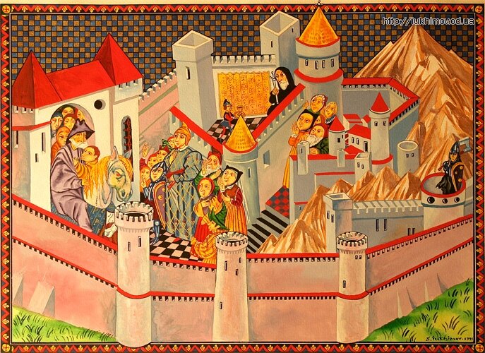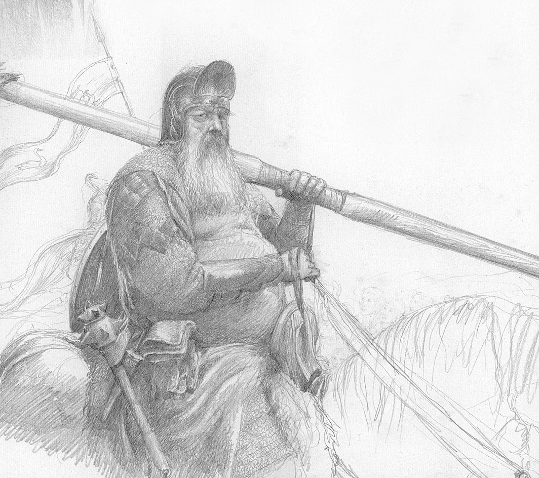 Это должна была быть лиричная картинка по своему настроению, немного искаженная как эффект рыбьего глаза. Идут грустные воины, на фоне их сдержанно приветствует толпа, а центром композиции является взгляд уставшего центрального воина, направленный на зрителя. Гамма картинки сдержанно теплая, охристо-желтовато-зеленоватая, холодные лишь доспехи воинов. Я поработаю над этим спустя много лет.