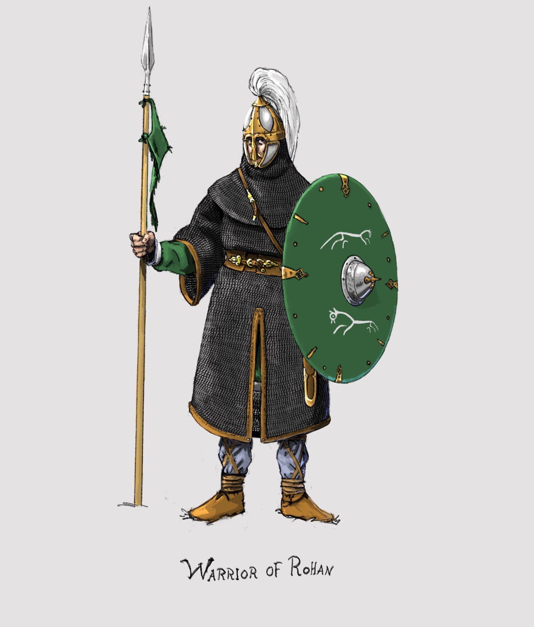 >>560876 По каким источникам сделана реконструкция? В книге всего то в двух словах описаны всадники Рохана - кольчуги до колен, лёгкие шлемы, длинные копья, мечи и щиты. Никакие пластинчатые доспехи как на этой картинке не упоминаются.