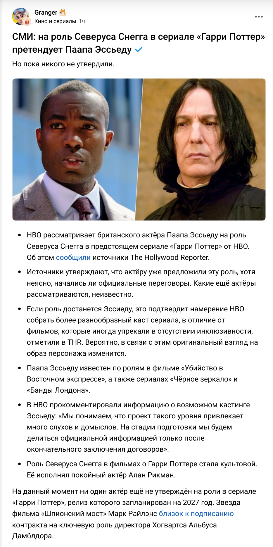 Скажите спасибо, что Хогварц Легаси вышел. Он изменит ход событий полностью. Уже была новость, что сиквел игры свяжут с сюжетом сериала. Что это означает? WB крайне серьезно оценила успех видеоигры, и будет придерживаться именно этой формулы. Провальные эксперименты с тварями их пошатнула. За сериал взялись, потому что твари не смогли стать самостоятельной франшизой и ответвлением. Теперь когда они увидели, что какая-то там игрулька показала результат лучше, чем твари все вместе взятые, естественно они направят курс сериала в точно такое же русло. Я думаю будет нормальный сериал. Да, естественно уровень Азкабана они не достигнут никогда, таких профессионалов уже тупо нет в индустрии кино. Но сделать лучше, чем высерки Йетса - запросто. Конечно кому-то придется потерпеть, побугуртить с черной Гермионы и остальных приколов разноцветного гендерного разнообразия, но не думаю что все будет совсем убого. Провалы Кольц Власти и Ведьмака - наглядный пример всем шоураннерам сериала по ГП. Я не знаю что должно случиться, если они все вложенные сотни миллионов реально просрут точно также. В такое я не верю, это будет сюр, окончательно сойду с планеты.