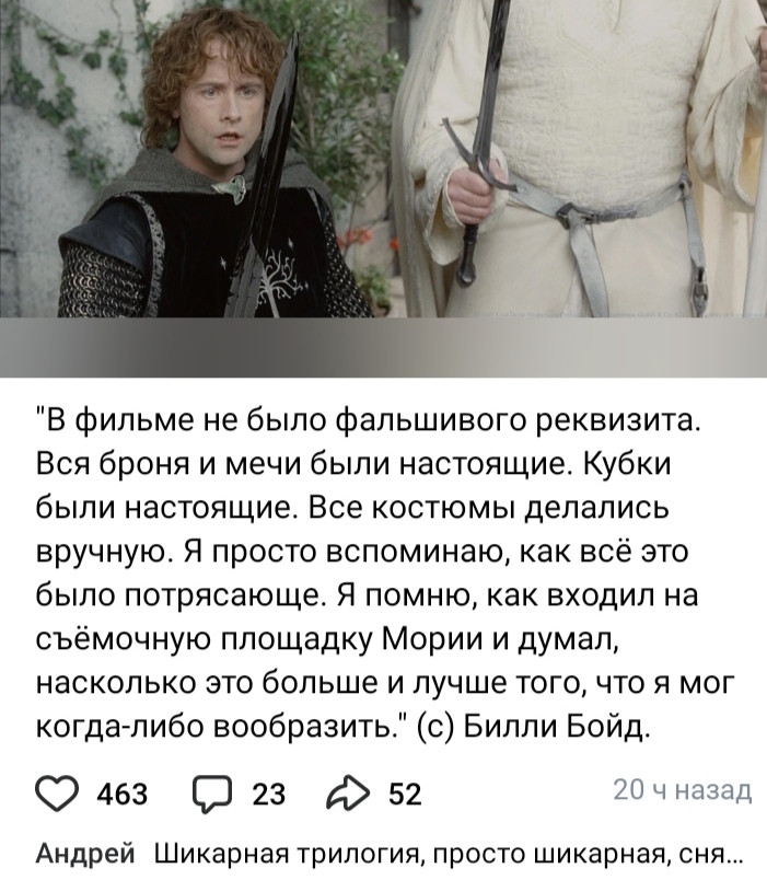 Властелин колец это реально шедевр, как ни крути. Визуал, музыка, вселенная, экшен - у трилогии нету слабых сторон. И при этом это не какой-то там фильмец на 90 минут, это охуенно большое и комплексное произведение на 10 часов, которое при этом ни разу не проседает в интересе. Сомневаюсь, что ещё увижу когда-нибудь что-то хоть сколько-нибудь равнозначное по масштабу.