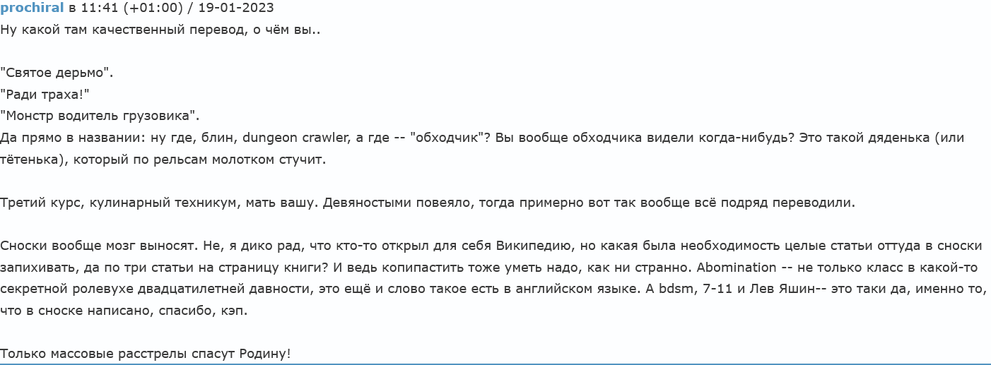 >>605709 >писать полудвачерским языком с тонной кринжовых и пошлых шуток через каждую страницу У меня не было таких ощущений от книги и гг. Ну да, любит похохмить, но таков персонаж. Реальный кринж - пеховская гоблинша.