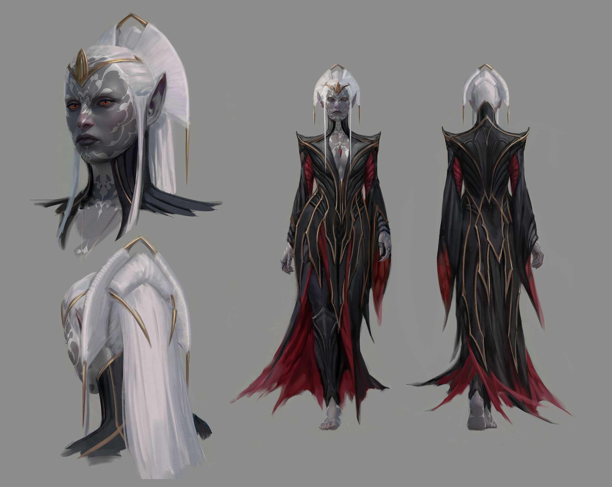 >Lolth is the corruptor and her markings, Lolth’s Embrace, are visual evidence of that corruption. And not every drow has them. Lolth cult members are ‘gifted’ those markings as a result of their connection to the deity. It was an opportunity to introduce more of the spider theme in a visual way. Any Drow that has Lolth’s favor gets these markings that creep up over the skin. The more you embrace her teachings, the more pronounced those markings become. But if you fall out of favor, they start to fade.