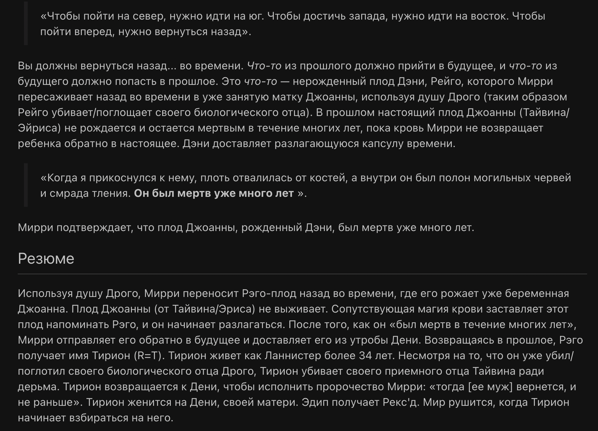 А вообще в этой модели есть логическая дырень, в виде мотивации Станиса сжигать свою ради воскрешения кого то выебистого бастарда. А это сделать должен он. Во первых это его единственная корова, во вторых так Мартин сказал. В принципе и у леди Мелисандры с этим туго. Да, она течет от него в три ручья, но не видит еще в нем спасителя мира, ради которого стоит пожертвовать ребенком.
