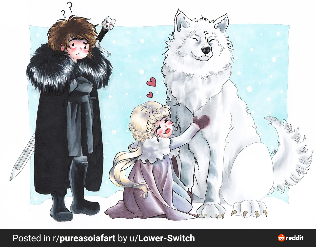 >Призрак хотел пойти с ним, но Джон его не пустил Тут слабое место, конечно. Призрак должен был видеть (чуять) настоящую личность. Хотя, мб это просто фраза такая. Типа не пустил. Но там же не писано, что он не пустил в своем обличьи. Мб он в облике Тормунда его не пустил?