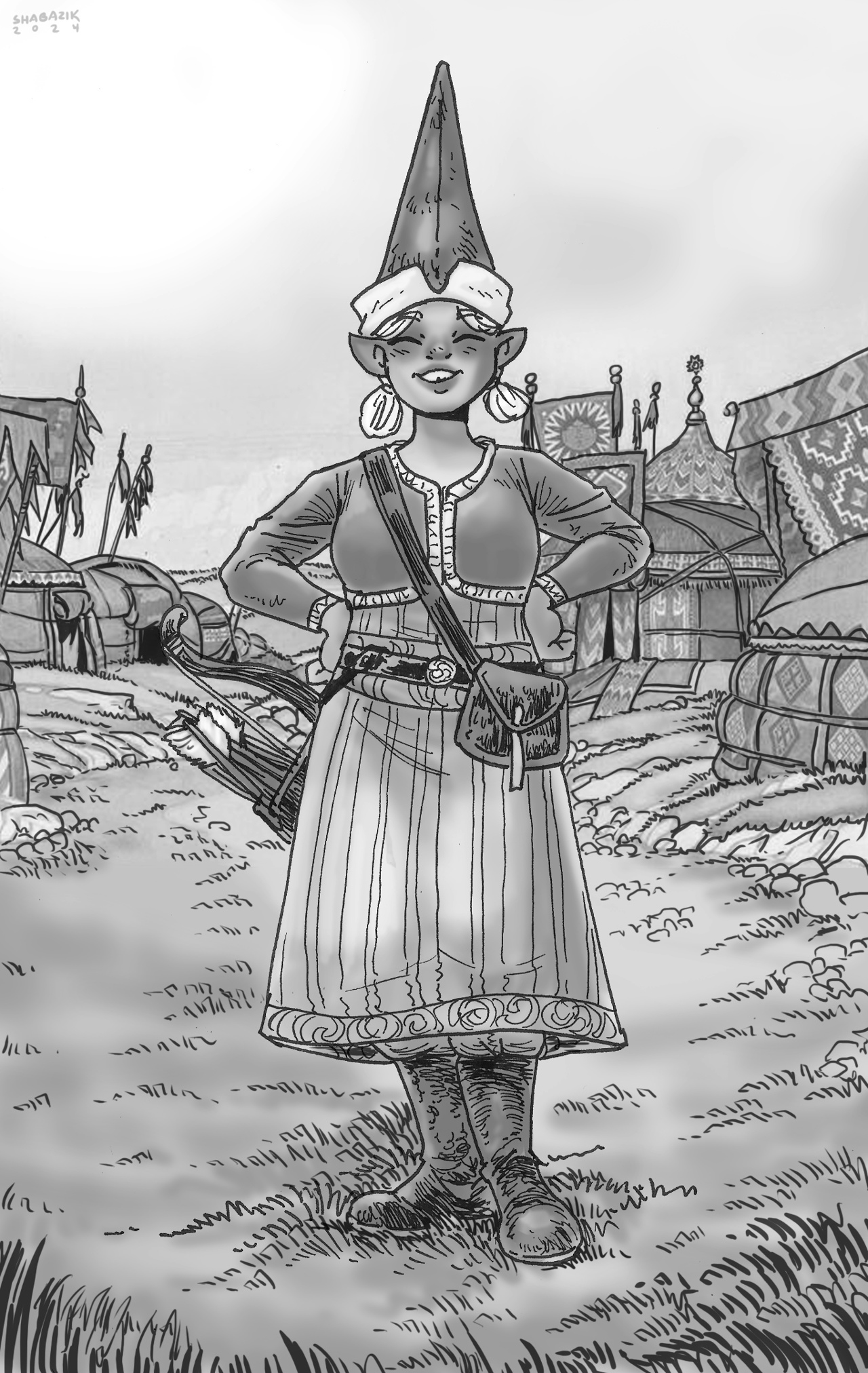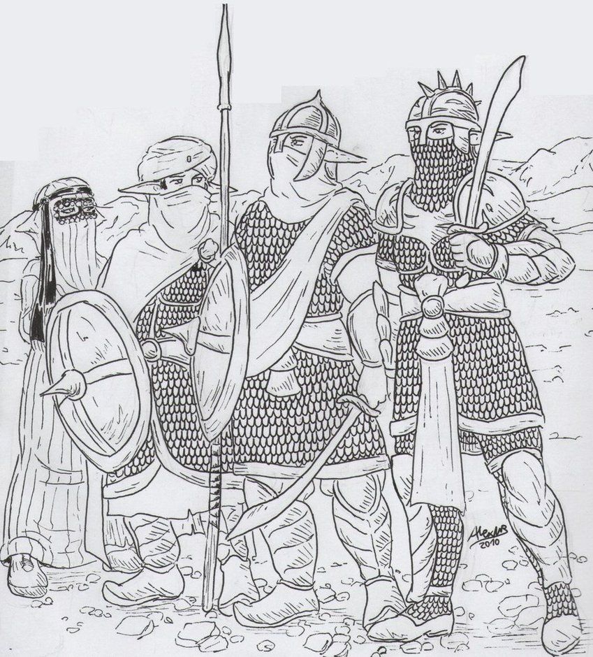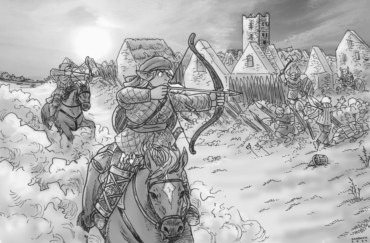 1. Кочевник-эльф с головным убором в половецком стиле. 2. Эльфийские вспомогательные силы Голиатской Империи сталкиваются с герцогскими эльфийскими вспомогательными войсками Шабии. 3. Рейд у приграничного города в Голиатской Империи. Сожжён эльфами и отбит наёмниками. 4. Война, конные лучники Баронства атакуют линию Герцогства. В высокой траве засада лучников и застрельщиков.