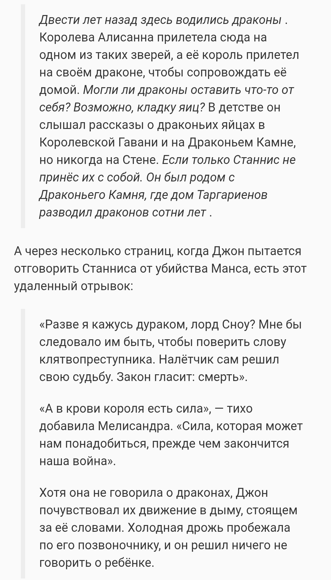 Инфа про драконье яйцо от автора gsteff со среддита. Удаленный отрывок из размышлений Джона. И без этого хватало предзнаменований о яйце Мел, но тут уже совсем жирный намёк. Ясно короче: яйцо, дочка и маг на стене, о ритуале Дени могут разузнать и пойдут жечь ещё до столкновений с иными. Не будет это жестом отчаяния. Стас сознательно отправит ребенка в костёр для буквального, без метафор, пробуждения дракона. Погибнет ли Ширен и вылупится ли дракон - вопросы остаются открытыми