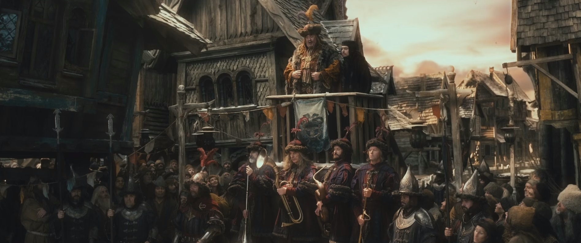 22 сентября 2941 года Третьей Эпохи, в день 51-летия Бильбо Бэггинса, хоббит Бильбо и гномы, скрытые в бочках, прибывают в Озерный город. Бильбо освобождает гномов, открывая бочки и вместе они отправляются на пир к бургомистру Озерного города. Появление гномов, в особенности Торина, объявившего, что прибыл сын Траина, внук Трора, законный Король под Горой, вызвало всеобщий энтузиазм и необыкновенную радость у жителей Озерного города, решивших, что очень скоро в их город потекут золотые реки с Одинокой горы. Прибывшим оказали роскошный прием, предоставили им большой дом и всячески за ними ухаживали. В Озерном городе они пробыли более 2 недель, отправившись в дальнейший путь к Горе 9 октября 2941 года.
