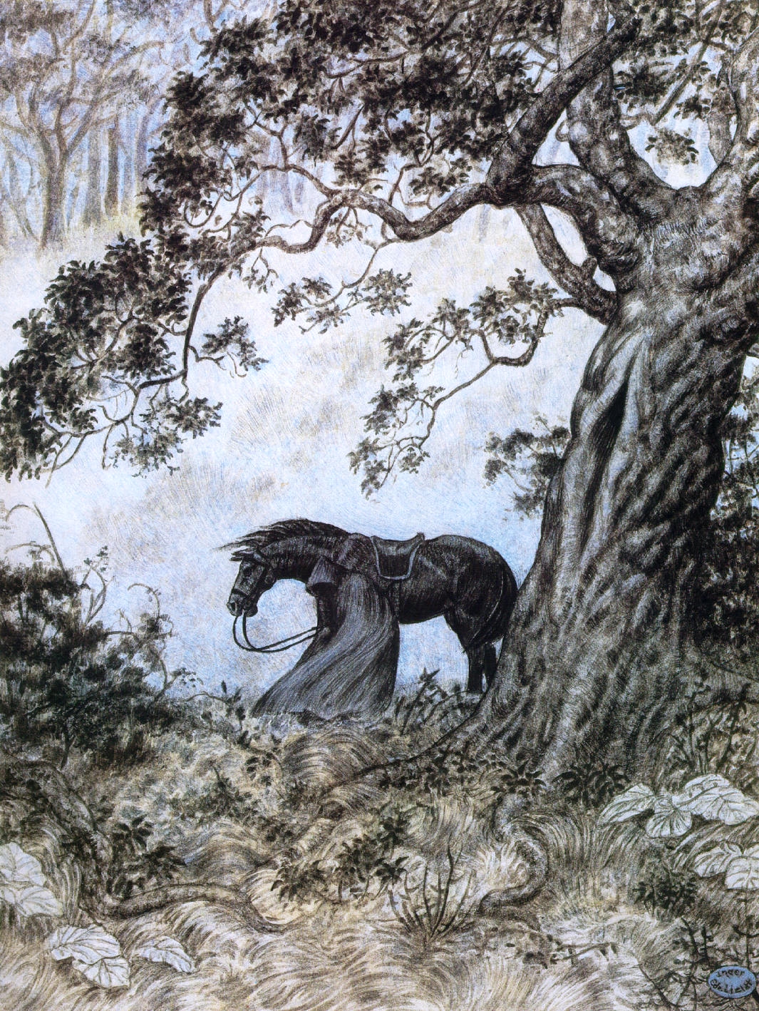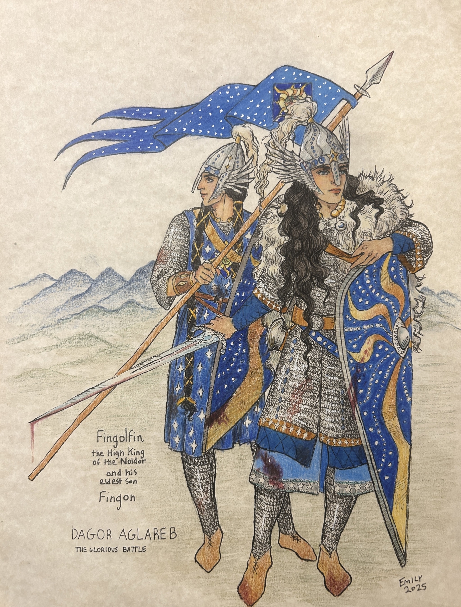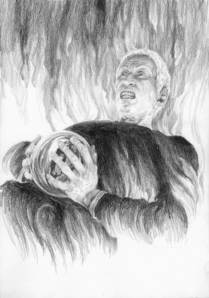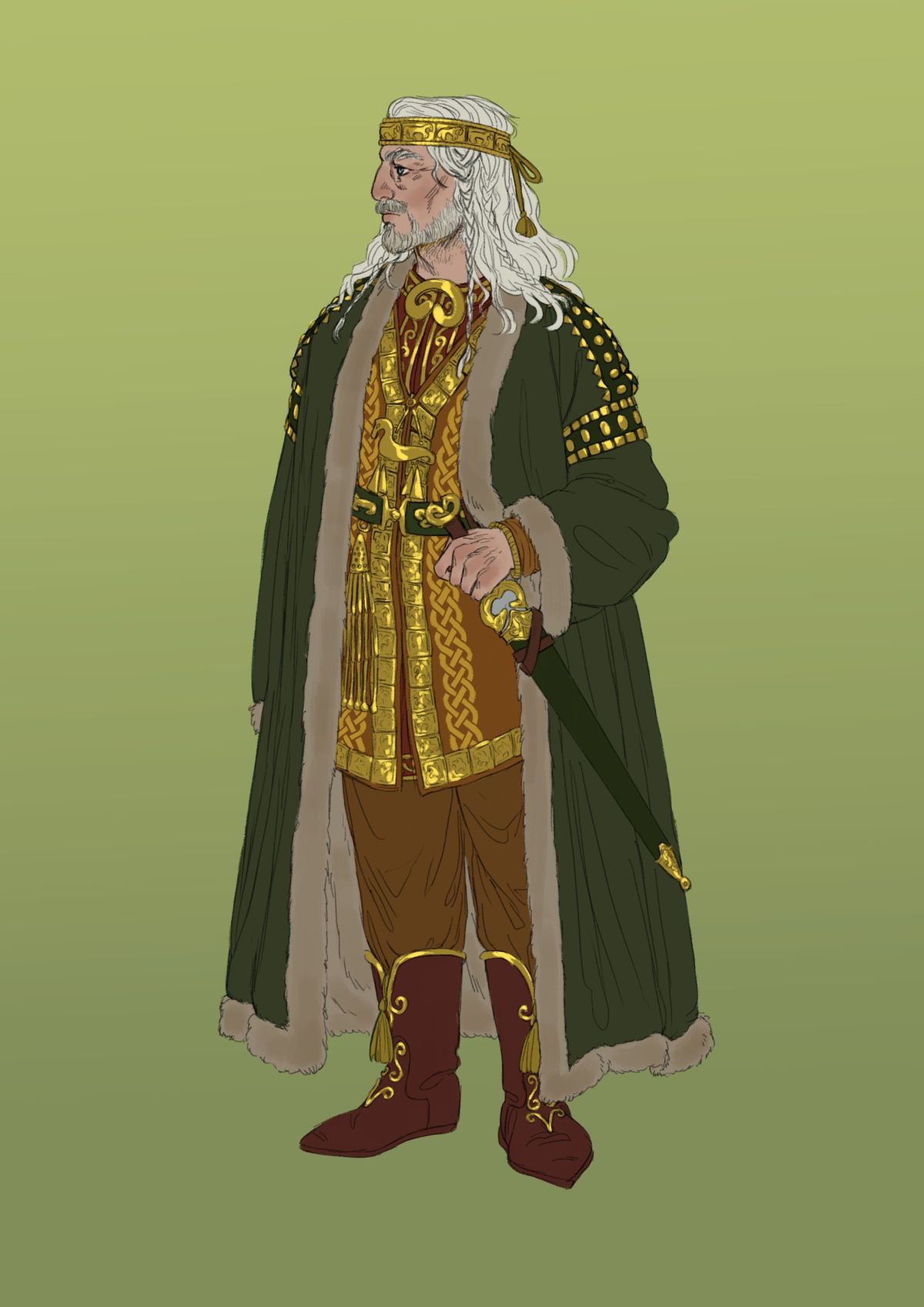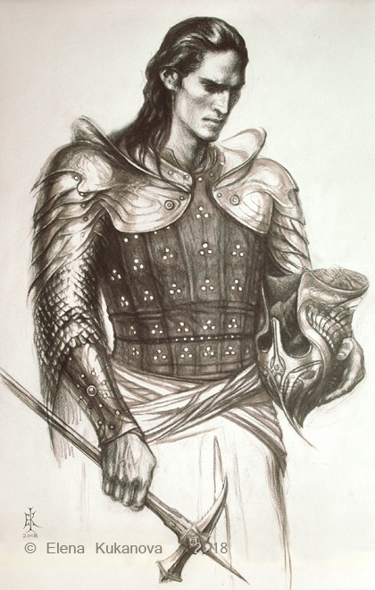 Комментарий художника: Ещё один набросок, который месяцами лежал в стороне. Можно было бы доделать, но я решил отпустить — думаю, я достиг того, чего хотел. Для меня это именно книжный Теоден. Не только могучий воин-король (о котором в какой-то момент сказано, что он подобен самому Ороме), но и «добрый старик» (как Гэндальф говорит Пиппину), чья память потом довела Мерри до слёз. Старик, в котором есть доля смирения, озорная улыбка и блеск в глазах, а ещё — щепоть чёрного юмора, звучащего у него в устах. Мне нравится, как Толкин противопоставляет его более холодному и возвышенному Денетору. Это часть профессорского почтения к «малому и слабому», которое пронизывает всё его творчество — и явно, и тонко.