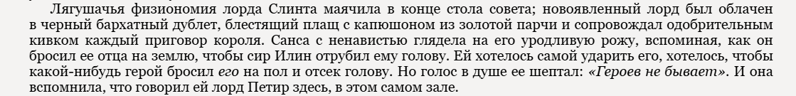 >>612940 А сопли на пол главы о жестокости друзей, врагов, любовников и богов(причем это у всех повов почти, кроме какого нибудь Хотаха лол), пополам с рассуждением о том как Барристану хочется Эшарочку, Аше хочется сосать хуй и обмазываться персиками, Давосу хочется к жене и сыновьям, Арье хочется к маме и брату, а Джейме хочется снова стать молодым, это база или соя?