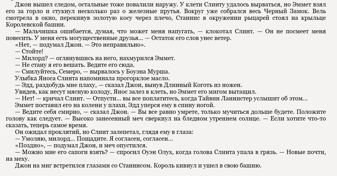 >>614419 >жом очевидный клятвопреступник В третьей книге он еще не клятвопреступник. В пятой - да. Но и там его клятвопреступление полностью оправданно. Арья > обрыганские черные братья >арья мелкая маньячка Не она такая, жизнь такая, хули. Мартыня же рассказывал что пишет образ Арьи с африканских детей войны, которые там в подростковом возрасте и в этнических чистках участвуют, и в пытках, и в прочих веселых вещах. Потому что до этого вокруг них так поступали с их собственными близкими. Ну короче порочный круг насилия и ненависти, вся хуйня. >санса просто дура набитая К последним книгам она поумнела ощутимо. Но еще есть куда стремиться конечно. Надеюсь правда что в итоге это приведет не к сериальному убожеству последних сезонов. >Остается только дыня, но и она уже начинает раскрывать свою шлюшачью натуру Что ты имеешь в виду под шлюшачьей натурой? Что она такого делает в последних книгах, чего не делала в первых? Жестче стала? Ну есть чутка. Дальше больше кстати. >>614423 >Санса тупо мечтает чтобы её врагов кто-то сильный порубил Временами это кстати работает, см пикрил. >а он продолжал пускать стрелы Если это намек на Игритт, то ее не он убил, у него по моему оперение на стрелах в колчане другого цвета было, если я верно помню. >>614425 >Арья - беготня озлобленного зверька Так в этом и фишка. Демонстрация реалий войны с точки зрения маленького человека, а не сильных мира сего. >Дунк - слабенькая литература на отъебись Да просто формат другой. Это короткие рассказы, а не романы. Поэтому там всего поменьше и помельче. А глубина роуд-муви Бриенны в Пире стала возможна только благодаря всем остальным сюжетным линиям и событиям в Речных землях в 2-4 книгах.