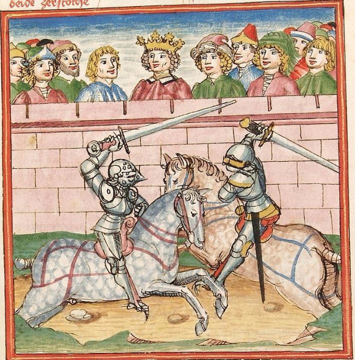 Поединок на полэксах. Гравюра из турнирной книги императора Максимилиана I «Фрейдаль»[англ.] (1512) Подвешенная стойка: Это — последний пример превосходной защитной стойки, предлагающей боковые удары маиллетом и уколы нижним шипом в качестве предпочтительных атак. Из подвешенной стойки можно быстро перейти в среднюю стойку, опустив заднюю руку к бедру. Если при этом передняя рука пойдет вверх, движение головки по большому кругу завершится мощным ударом молотком сверху.